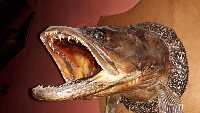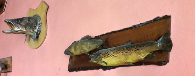 Мірослав попросив поїхати з нами, щоб випити пива. Інтер’єр корчми суто рибальський – на стінах висять трофейні харіуси та форелі, а ще голова зубастого хижака.