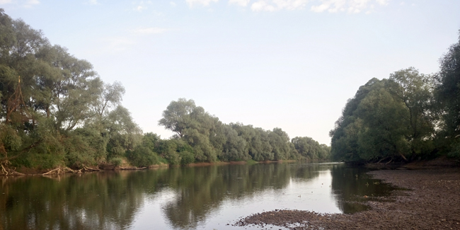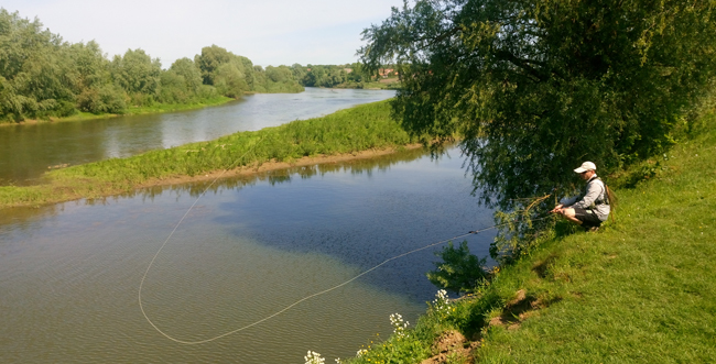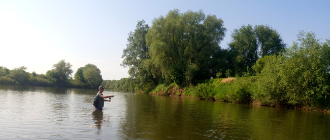 Я пройшов досить солідну відстань, поки не побачив зручний спуск до води. Розумів, що риба тримається протилежного берега (ну, як завжди), куди дістатися дуже не просто. Вже посеред ріки течія зносила, що знову змушувало згадувати про комфорт. У мене були лише поодинокі виходи, але нічого цікаво. Ні на жука, ні на мокру. Біля мене розташувалися Юра та Діма і вони спіймали по невеликому голавлику. Я все ще шукав місце, де можна зручно розташуватися. І повернувся назад.