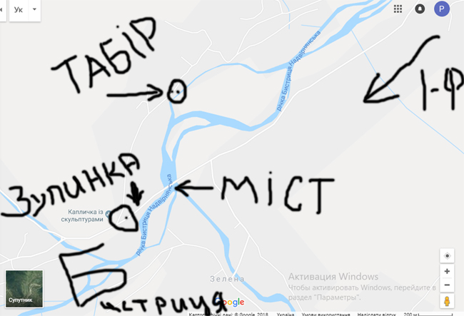 Можливо, піратам було простіше малювати свої карти, бо в них не було фотошопу. Але, гадаю, ми всі розберемося у моїх мальовидлах. Отже, насамперед, зайдіть в гості до гуглмапсу і введіть координати (48.540137, 24.355771). Це приблизне місце розташування нашого табору.