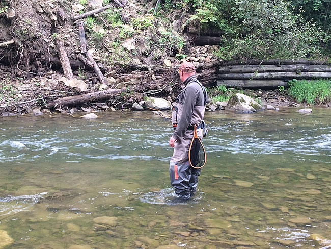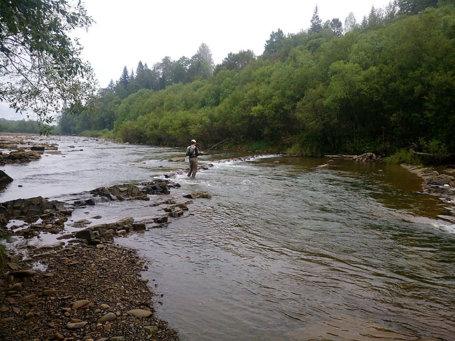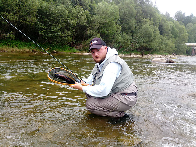 Київський нахлистовик меланхолійно пересувається з одного місця на інше – мені б такий спокій! Але крім всього іншого він по трохи виловлює із річки сріблястих красенів. Вони доволі активні, беруть на невеликі німфи. У підсумку, Володя упіймав п’ятьох рибин – дуже пристойний результат.