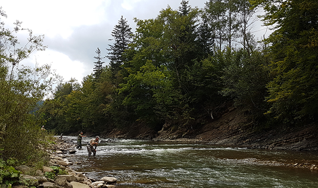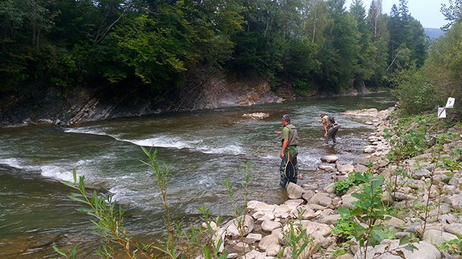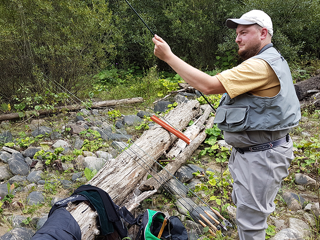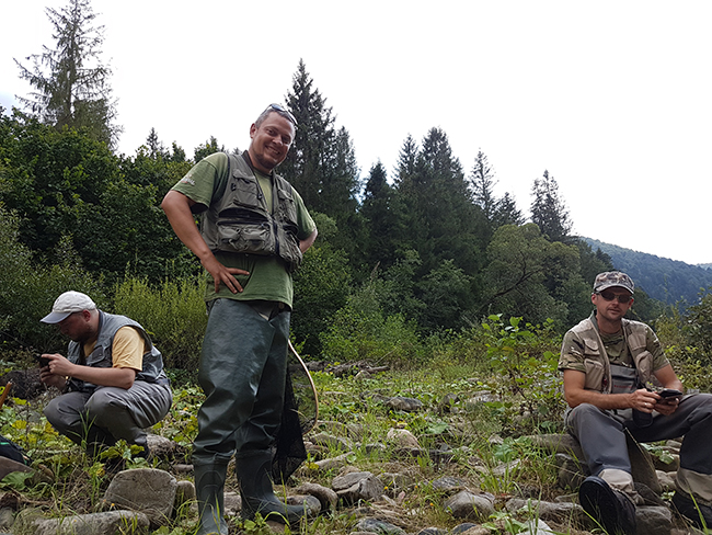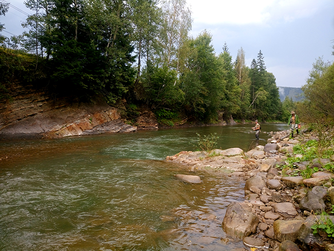 Ваня Магула та Макс Кусакін у підсумку упіймали по три риби (в Макса усі були більшого розміру), питання було тільки в тому – що не так із нашим пулом? Прийшов час і мені ставати до позиції. Я зготував практично увесь свій арсенал – оснастив вудки найкращими та найпрацьовитішими німфами, сухими і навіть стрімерами. Залишилася дрібниця – упіймати рибу.
