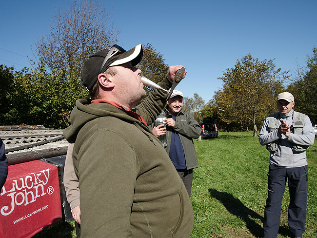 Повернувшись на базу ми зустрічали дорогих гостей. Із Києва приїхали Діма Чейлитко, Андрій з Оленкою та песиком Харді, а також Коля з Сашою; з Франківська Дмитро Петруняк з величезним бутлем домашньої малинівки; зі Львова Володя Судук та Данило Секунда; з Самбірщини Мирон Федорович та Юра Кінчик. Решта учасників мала прибути вже безпосередньо на самі змагання. Ми розвісили банери УЛН, Strike!, Lucky John та Norfin, Олег приготував нотатку із парами та пулами.