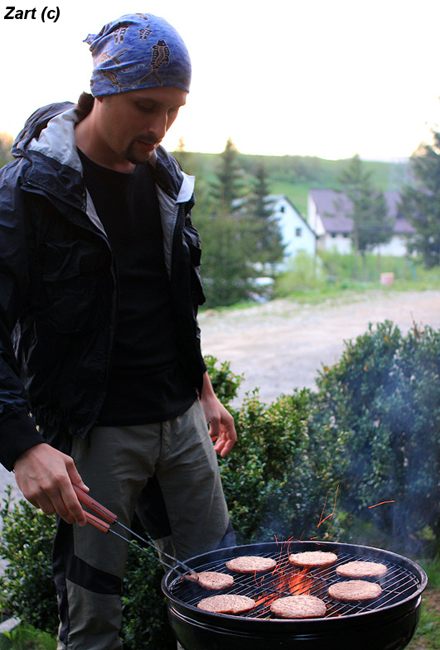 Вечеря на подвір’ї пройшла продуктивно – мене навчили користуватись грилем (до цього вмів тільки ватрою), Юра з Войтеком в’язали мушки, що спрацювали найкраще на Сяні (ті самі ред таги від Ростика), Ганка знайомилась з численними чотириногими мешканцями садиби… Полягали тільки опівночі, незважаючи на втому від дороги.
