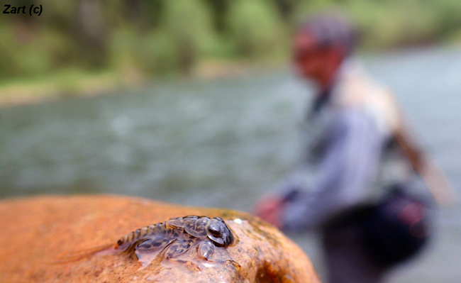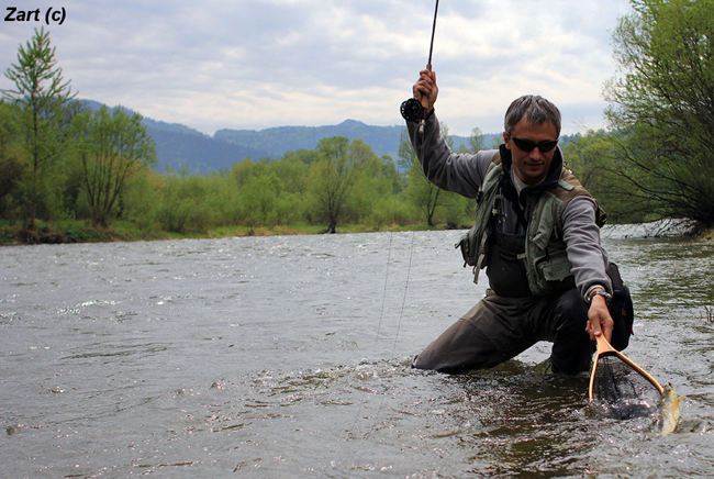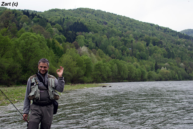 Щодо риби, то в Сані живуть приблизно ті самі види, що і в Дунайці. Струмкові форелі, харіуси та головатиці цікавили нас найбільше, звісно. І якщо у останніх двох нещодавно був нерест, і ловити їх не рекомендувалось (палкий привіт вітчизняним Правилам рибальства, їм такі тонкощі навіть не світять), то перша віддячила нам гарним клюванням навіть за таких складних умов високої води. І хоч середній розмір рибок був дещо менший, ніж на Дунайці, я б оцінив його у 25 см. Але за умови кількості спійманих риб у 2-3 десятки за риболовлю, це робило її просто незабутньою для українського нахлистовика. До того ж, окрім звичайних, всі зловили по 5-6 вже цілком гарних рибинок на 35-36 см, та й в якості прилову нам трапились кілька харіусів такого ж розміру… А Ганка взагалі вразила наповал, відмітившись рекордним “ліпєнєм” у 46 см. Жаль, не вдалось закарбувати на фотокамеру, це був справжній красень!