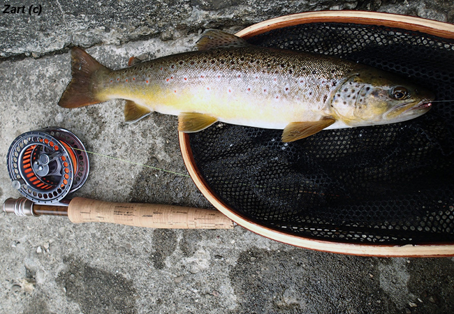 Юрко зловив з десяток, теж цілком “залікових” 25-35 см. І перейшов до Ганки, яка хоч зловила і менше, але дві рибинки були по 38 см, а одна з них на суху мушку! Виявилось, що він не прогадав, і в підсумку закінчив вечір “шалєньством” у півтора десятки риб, з трофеєм у 42 см включно. Я ж згодом приєднався до друзів, зловив рибку на суху, і поверувшись до німфи, змінив верхню на “Золотаву, №22”, що себе виправдало – у короткий термін ще 4 невеликі, але стрімкі форелі побували в підсаку.