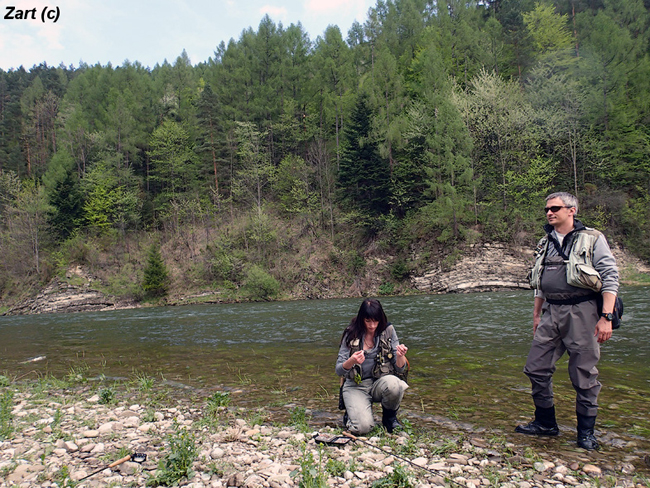 В повітрі літало чимало цікавих комашок – навіть кілька дебелих веснянок. Але риба догори вперто не виходила, тільки раз чи два я бачив кола на поверхні, тож ловили всі німфою. Войтек одразу показав клас, зловивши чималого харіуса, та й нам трапились невеликі пстружки. Юрко та Ганка зазначили, що річка за духом трохи схожа на Свічу. Мені такого порівняння зробити не вдалось, адже на Свічі не доводилось бувати. Але Бя(л)вка сподобалась одразу, своєю камерністю і дійсно неповторною красою.