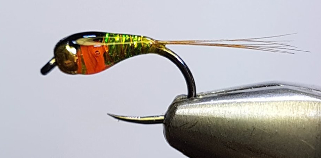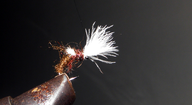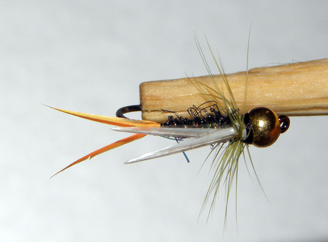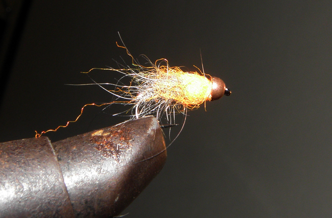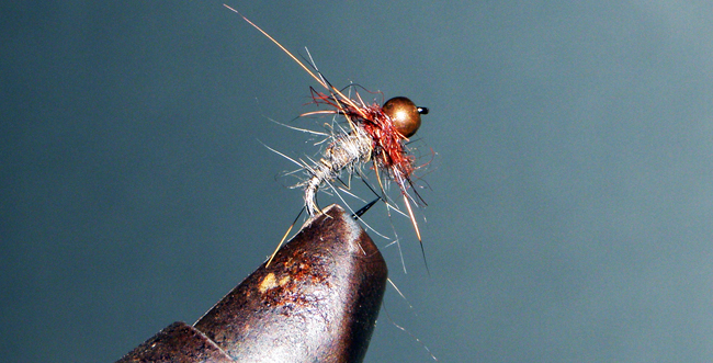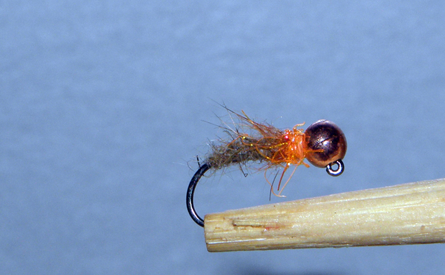 Моя улюблена осіння мушка, яка, як виявилося, прекрасно працює ще й зимою. Традиційно вона складається із мідної голови (вольфрам для “француза”, латунь для довгої німфи), натурального сірого даббінгу для тіла і натурального оранжевого даббінгу для торакса.