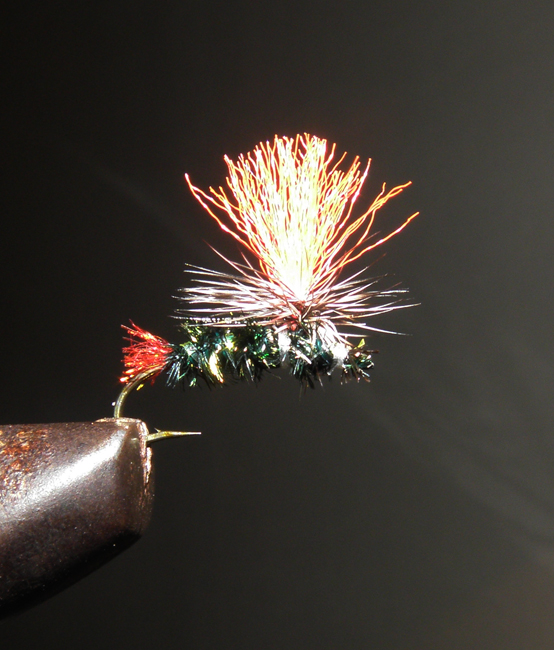 Замість традиційного тіла з павича використовував аналогічного кольору даббінг. В якості хекла – салатове перо зі скальпа когута.