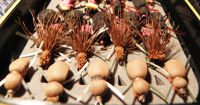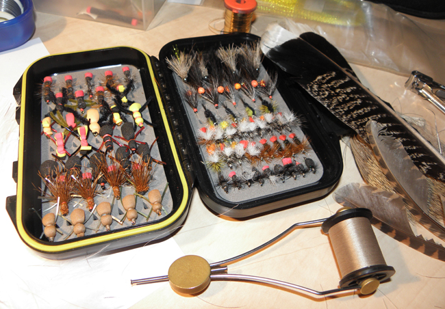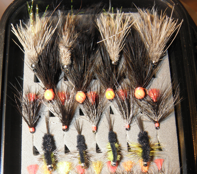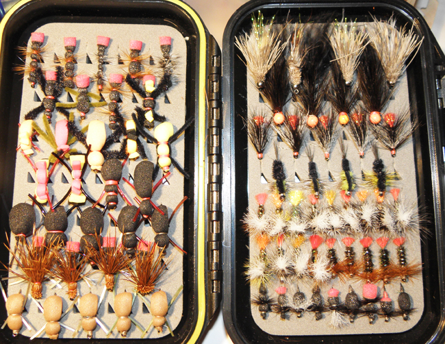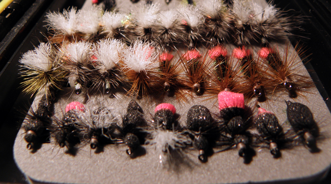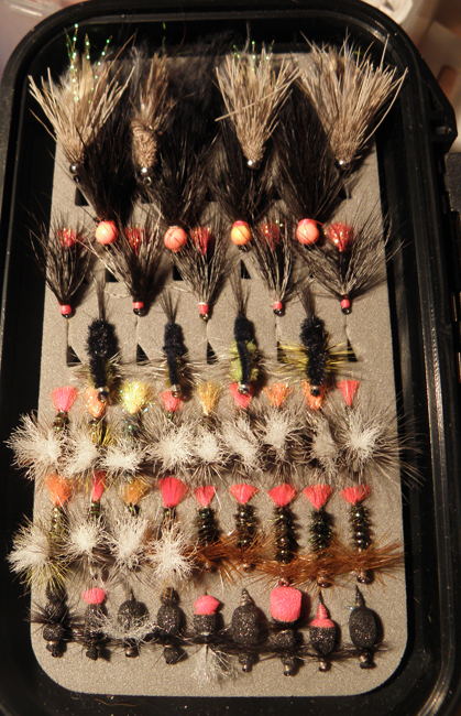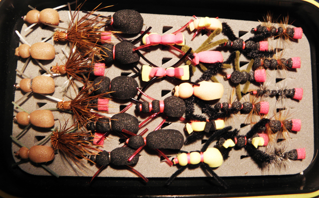 Права частина флайбокса – це сухі, мокрі та стрімери. Нижній ряд присвячений дрібним мурашкам. Все в них добре, от тільки одна біда – бувають періоди в дні, коли таку дріботу просто не видно на хвилях. Тіла робив із пінки, зокрема й тої, що йшла на гусениць і коників. Обмотка – традиційний чорний когутик, іноді додавав білого антрону – може знадобиться. Правда, якісь ті мурахи коряві в мене вийшли. Не буде риба ловитися на них – поріжу. Дві вищі лінії – ред-таги. Ну, воно й зрозуміло, куди без них? Праворуч – класичні, ліворуч і згори – парашути, які досить не зле себе проявили у минулому році. Бюджетних та дефіцитних матеріалів тут нема.