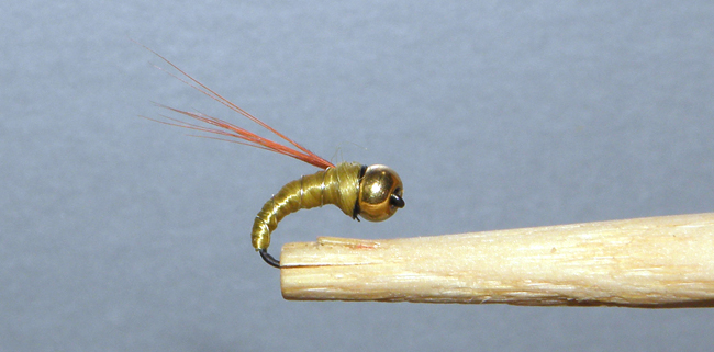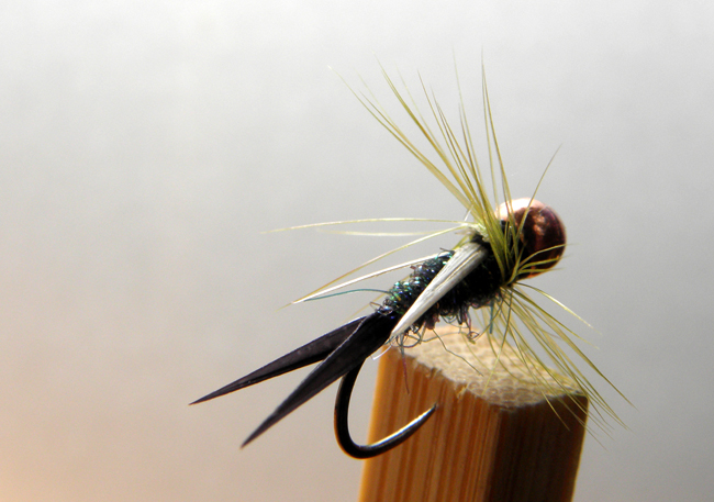 Цю мушку я піддивився на сайті Романа Мозера. Кажуть, що одна з кращих приманок на форель і харіуса взимку. Будемо пробувати. Зробив її з шовку Шекспір – одну з жовтуватого, іншу з брудно-оливкового. Характерний для цих німф є якась біда, що стирчить зі спини. У мене це пучок борідок з пера курки.
