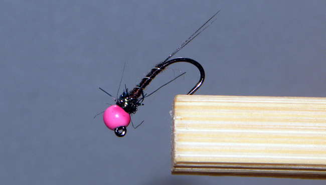 Кажуть, що взимку риба любить рожевий колір. Ось варіант шоколадки з рожевою головою і чорно-зеленим даббінгом. Наразі на неї не ловив, але буду пробувати. Гадаю, ця муха більше згодиться для методу довгої німфи на плесах із слабою течією.