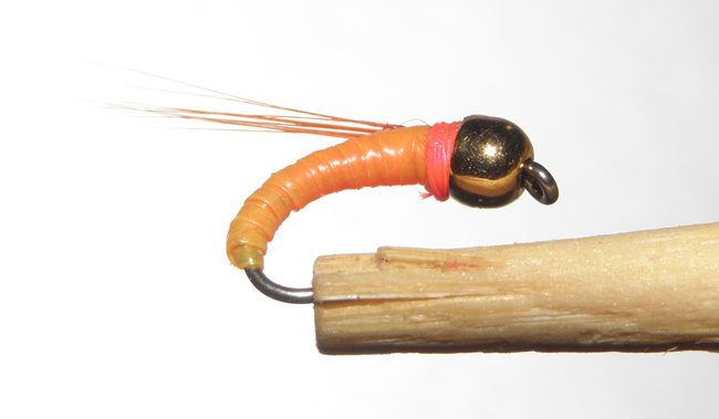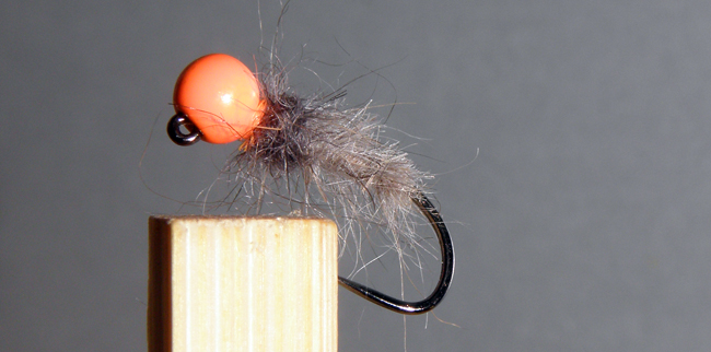 Відійшовши від власноруч придуманої “класики”, я спробував трішки змінити мушку – замість натурального оранжевого даббінгу давав даббінг типу Spectra. а потім об”єднував рудий торакс і мідну голову в одне: виходила помаранчева вольфрамова голова і сіре тіло з сірим же торраксом.