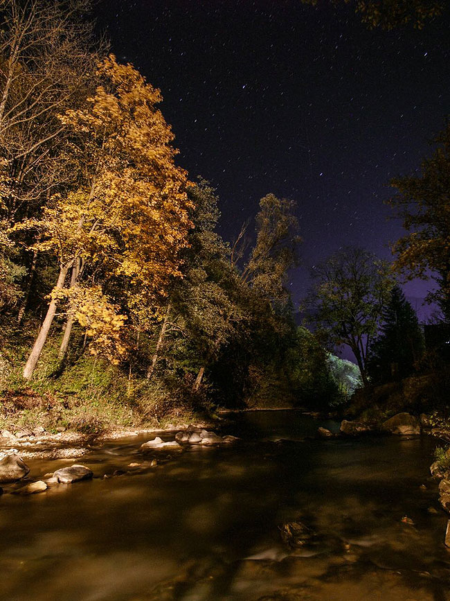 Я спакувався і попрощався з хлопцями. Вони відвезли мене до машини Сови. Правда, самого Олега не було видно, хоч починало смеркатися. Невдовзі прийшов Діма, який також наситився пирями удосталь. Він вирушив шукати Олега, я ж стояв, дивився на небо, яке щосекунди темніло. Ставало геть тихо, лише три вівчарські собаки-вовкодави ніяк не могли вгомонитися. Вони гавкали на уявних ворогів, проганяючи їх геть. А я насолоджувався останніми миттєвостями неповторного вікенду, проведеному в душевній компанії, на берегах мальовничої карпатської ріки…