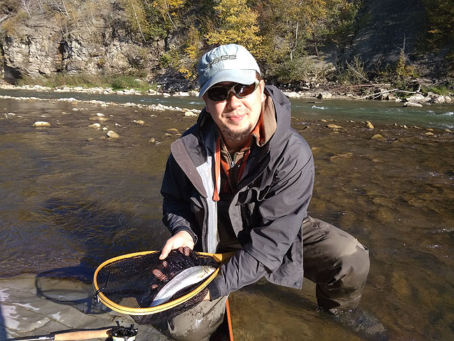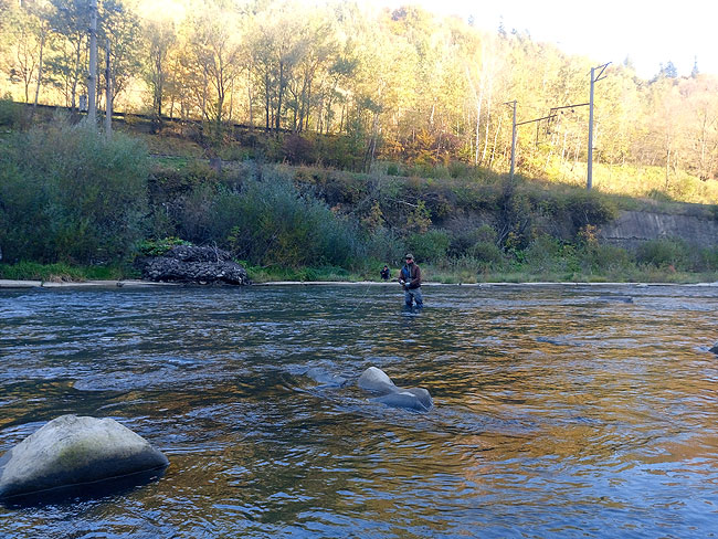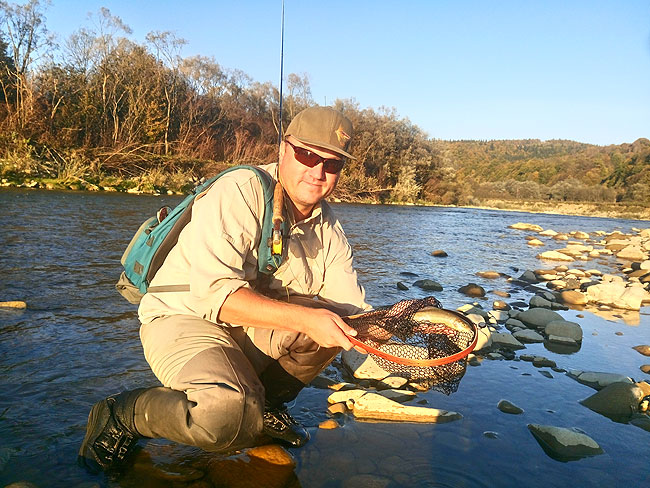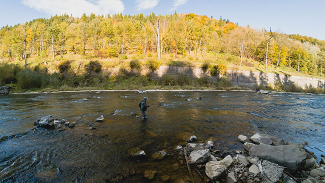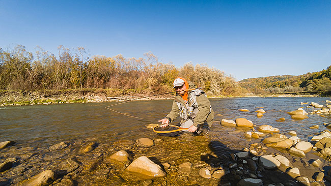 Жовтень та ранній листопад – це просто благодатна пора для нахлисту. Карпатський харіус нагулює собі черево перед довгою зимою, тому стає напрочуд активний. Цьому сприяють і погодні умови – холодна вода та відсутність спеки. Харіус набирає ідеальні кондиції, наливається кольорами і, що дуже важливо, легко відходить від виважування. Його вже не потрібно реанімовувати – він спокійно розвертається після звільнення із гачка і тихо повертається на своє місце. У той же час струмкова форель готується до нересту, шукає відповідні ділянки у потічках, тому її турбувати в жодному випадку не треба. Але буває й таке, що пструг може «сидіти» і між харіусами, як на ямах, так і на мілинах. Все ж, форель зараз – не наш клієнт, ми полюємо за красивим карпатським пирем.