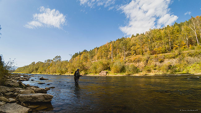 Щодо практичної сторони, то раніше справи з об’єктом подорожі у мене не складалися. Із цим реліктовим ендеміком я познайомився на Дунайці, коли рибалив там вперше. На німфу мені трапився один крихітний екземпляр, сантиметрів на 30. Я вже практично дотяг його до берега і попросив фотоапарат, бо бачив, що то не форель. Але риба примудрилася викрутитися і втекти (мій підсак зачепився сіткою за куртку). На Сяні, знову ж таки на німфу, ловлячи під протилежним берегом на Ельдорадо, на місці впадіння дрібного струмочка, невідомо звідки мої мухи вхопила метрова «торпеда». Я бачив її дуже добре: пролетівши на швидкості світла повз мої ноги, відчув лише характерний дзвін розірваного підліска. Пам’ятаю, як рука, що трусилася від шоку ніяк не могла вставити щелепу на місце. Нарешті, третя зустріч відбулася в Словаччині. Тут, правда, я не маю стовідсоткової певності, але на 99 переконаний, що боровся саме з цією рибою. І знову спрацювала німфа. Затягнутий фрикціон (він був спеціально підрегульований для півметрових райдужок, які могли, приклавши зусилля, стравити собі 3-4 метри шнура) передав мені «привіт», а риба за кілька секунд була вже на протилежному березі Вагу. До чогось подібного я був не готовий.