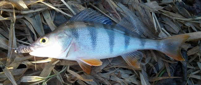 Діло було на озері, практично повністю затягнутому льодом. Лише в одному місці, куди впадав потічок, можна було ловити. Саме там окунець і взяв. Окрім нього на німфу спокусилося ще три окуні, але дістати їх не вдалося.