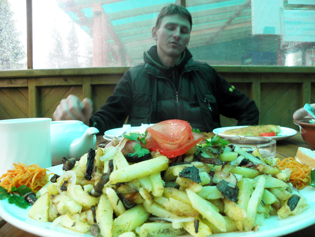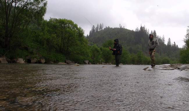 Обідати поїхали в гірський ресторанчик, де спакували у свої шлунки страви карпатської кухні. Геник їв з розумом, а от ми з Юрою, схоже переборщили. Десь півтори години ми сиділи під навісом, слухаючи як дощ тарабанить по склу. Але їхати додому ще не хотілося, тож ми вирушили на іншу річку. Спершу здалося, що вона чиста, але насправді вода була геть каламутна. Геник таки видурив пирика на суху, а ми з Юрою зловили облизня. Через півгодини вирішили повертатися.