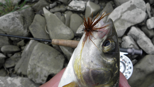 Після трьох-чотирьох варіантів я зупинився на простому варіанті з коричневим тілом, звичайним хвостиком та обмотки з когута. Роль крила виконував білий антрон. Одразу ж почалися виходи. Оскільки я йшов вверх по течії, першим взяв невеликий харіус, а за ним вже значно більший.