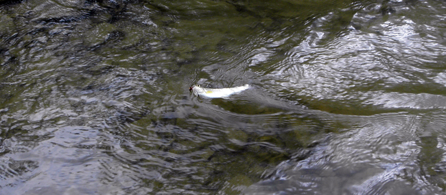 Німфа мене одразу ж розчарувала. Тому замість індикатора я прив’язав ще один повідок з великою сухою мушкою – моєю варіацією на тему елк-хеар-каддіса. Одразу ж черговий вихід, але тут я дав маху – не зорієнтувався і риба легко зійшла.